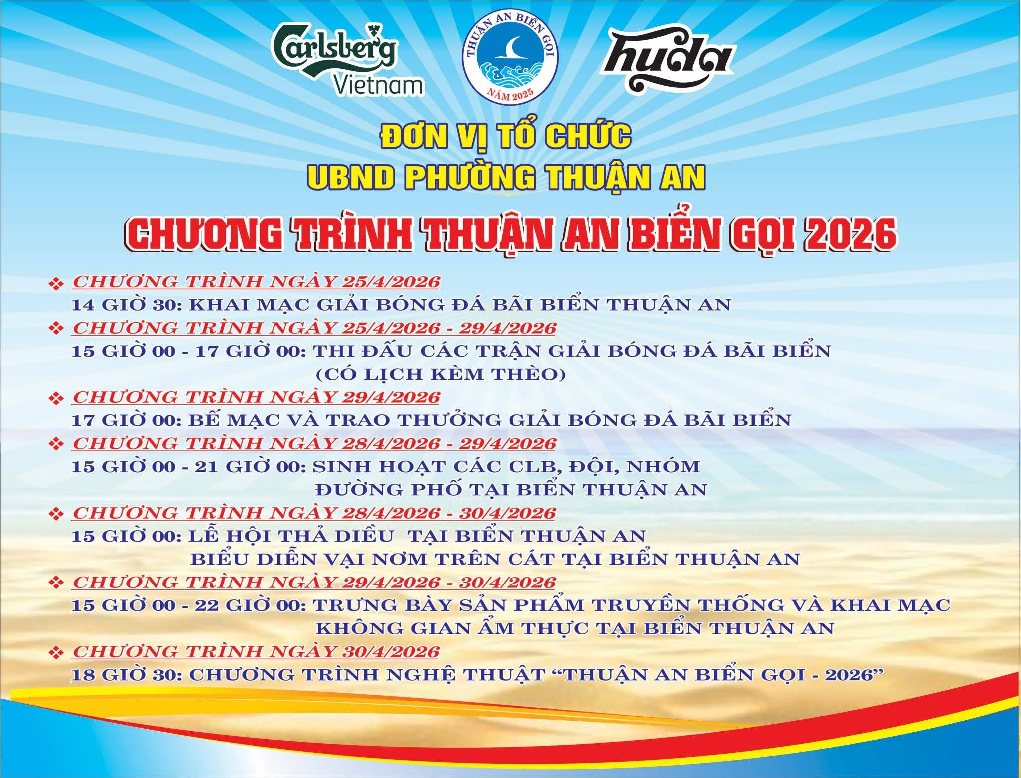 "Thuận An biển gọi năm 2026" bao gồm các chuỗi hoạt hoạt động: Giải bóng đá bãi biển; trưng bày sản phẩm truyền thống và không gian ẩm thực; biểu diễn vại nơm trên cát, sinh hoạt của các câu lạc bộ, đội, nhóm; chương trình nghệ thuật “Thuận An biển gọi”…